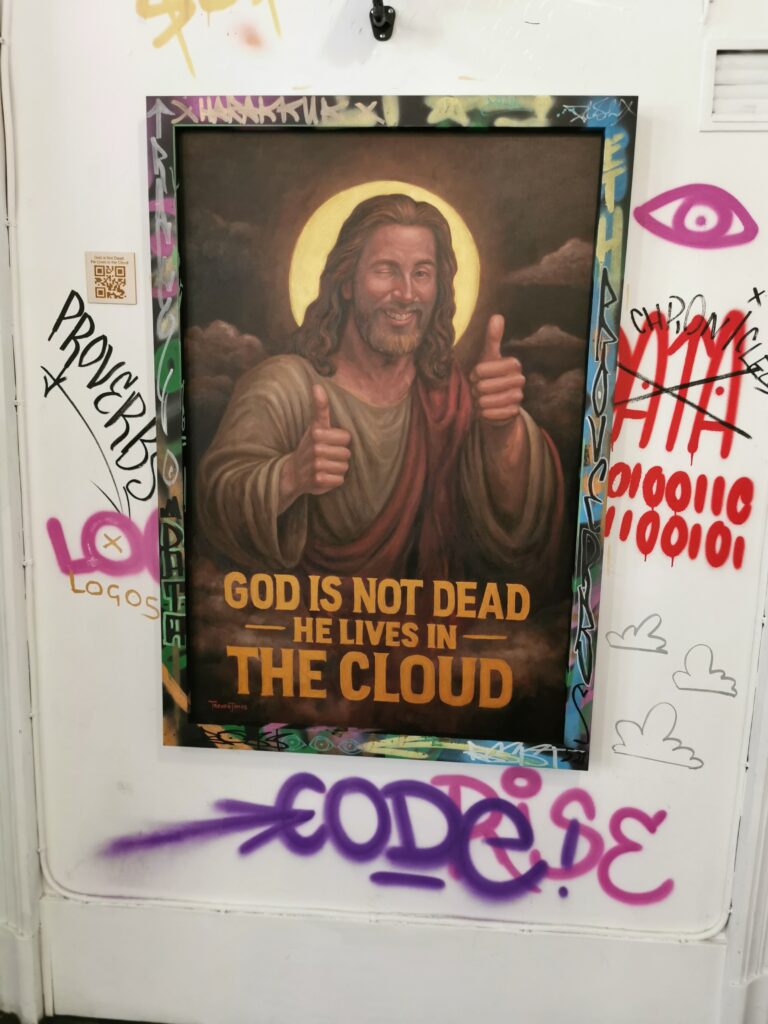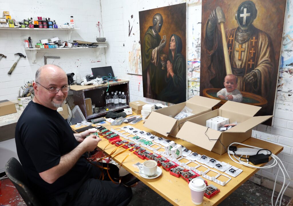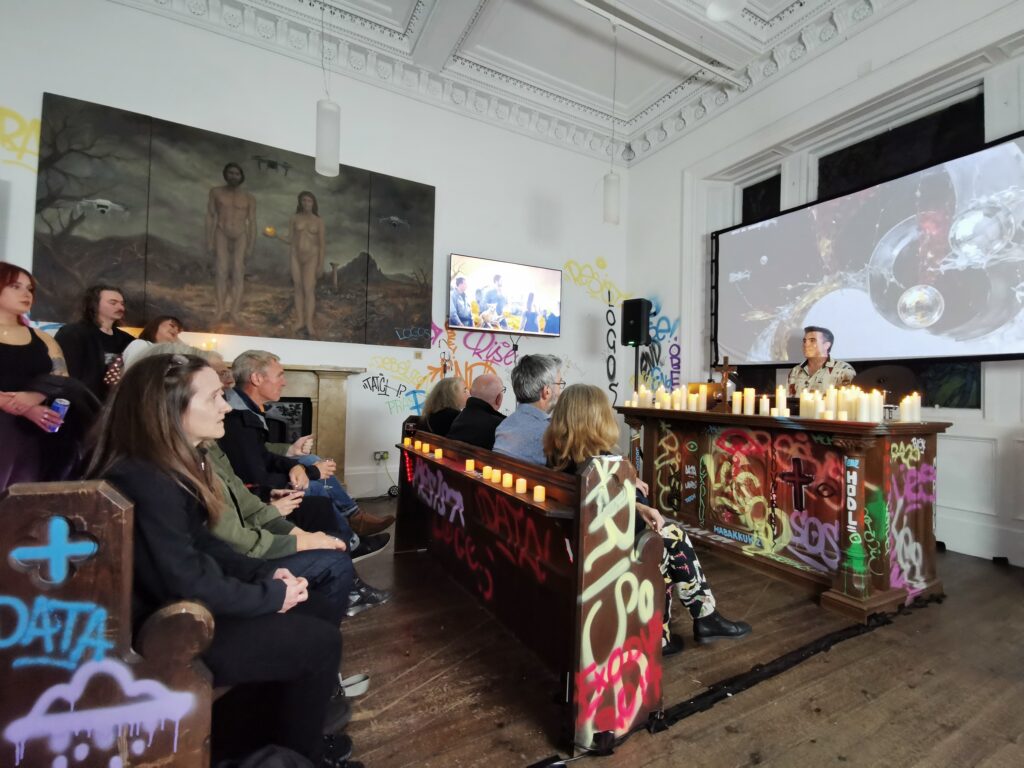 Trevor’s oil paintings merging the seven sacraments with meme culture, robots, drones, and priests in circuit-board robes explored devotion in a technological age. Cameras beside them quietly recognised app participants through the selfies on their exhibition passes, recording who was present and how they engaged. That data later formed part of each visitor’s digital dossier.