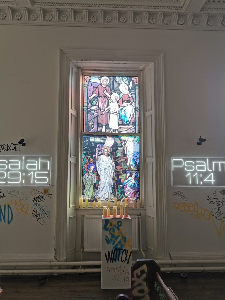 Meanwhile, graffiti artist Ross Macrae was painting directly onto the walls, pews, and even the altar. The water-based paint gave the show its rebellious edge but was chosen carefully, knowing we would need to sand, seal and repaint later to restore the historic space.