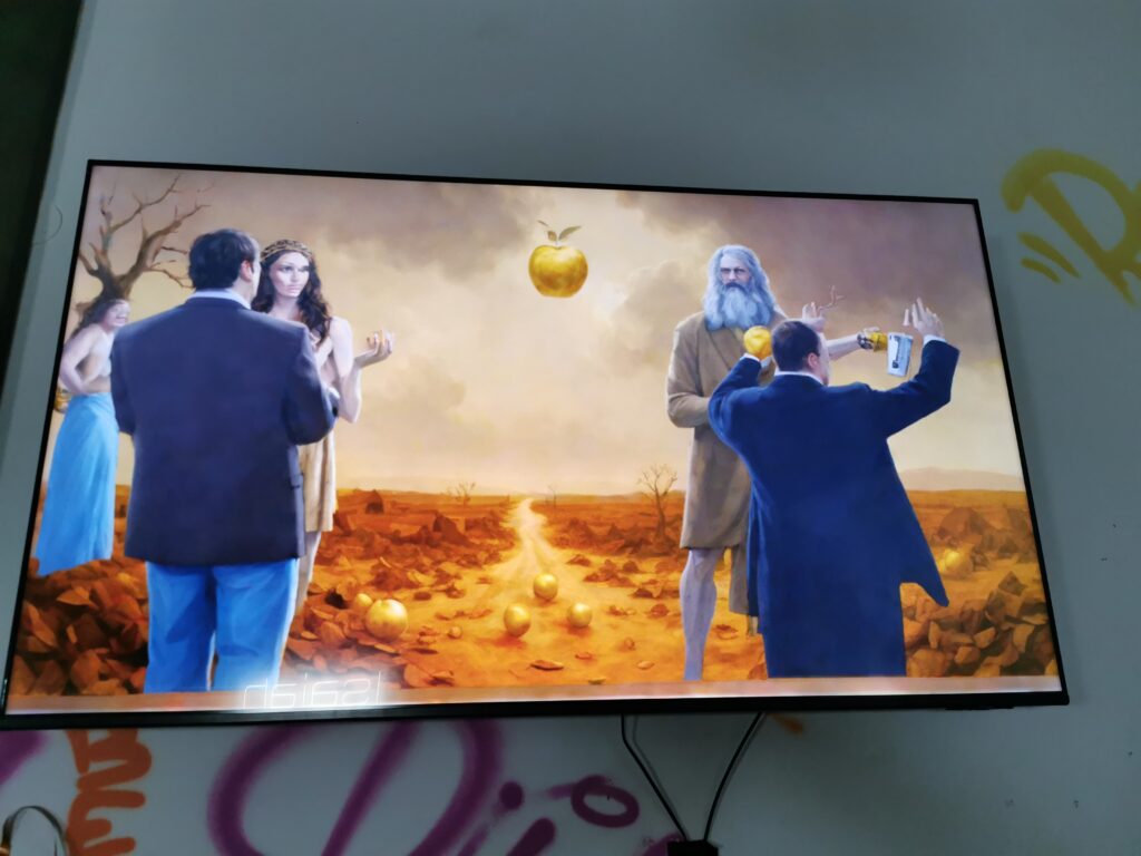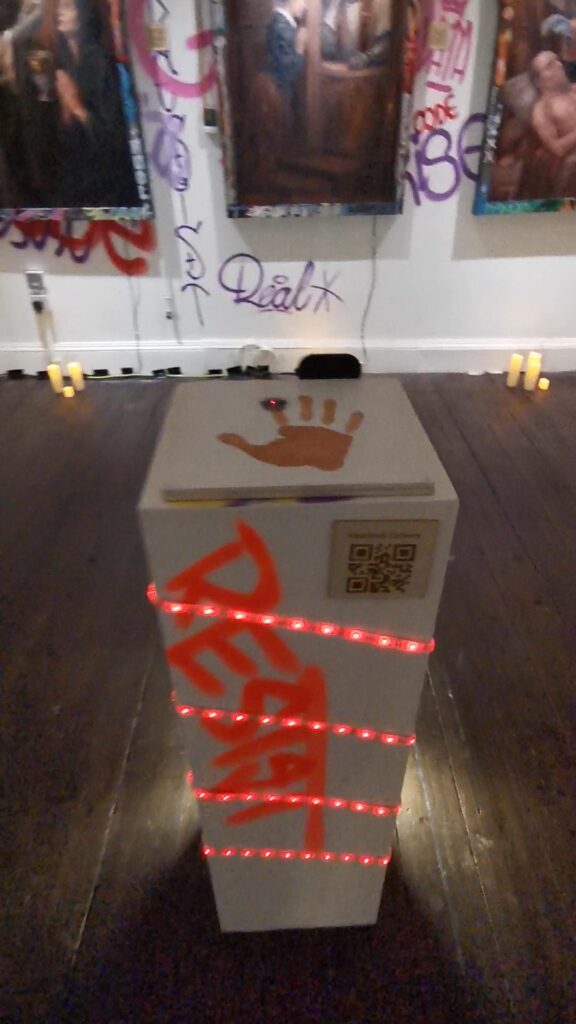 The building was beautiful and utterly unforgiving. With limited power sockets scattered across its rooms, every connection had to be planned in advance. The art setup faced its own difficulties too – from positioning works within a heritage space to lighting and placement. I designed and installed the full power and network layout, mapping cable runs, calculating loads, and ensuring safe, reliable operation. Remote devices ran on efficient power supplies, while others shared USB-based hubs that also illuminated the SacraMemes paintings with small spotlights.