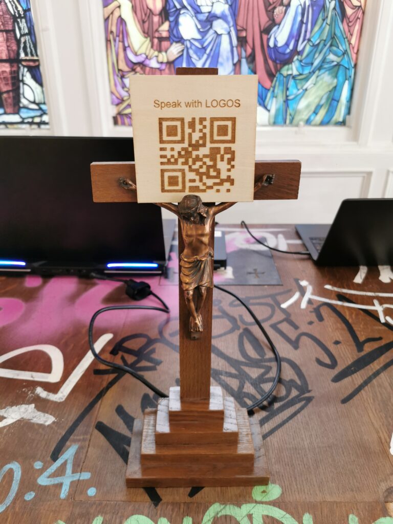 Visitors could open a private chat with LOGOS through the EXPOS3D web app, engaging in short reflective exchanges that fed into their anonymous journey data – a digital confessional asking visitors to “share a shard of yourself.”