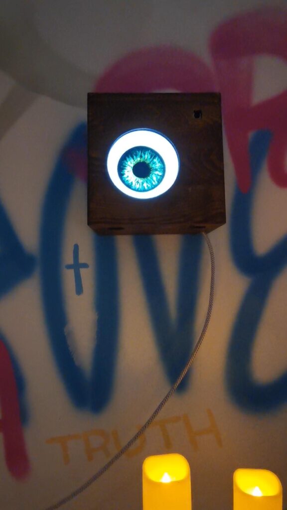 Four small, watchful devices distributed through the space created a sense of being seen. They responded to faces, motion, and proximity, extending LOGOS’ presence throughout the building.