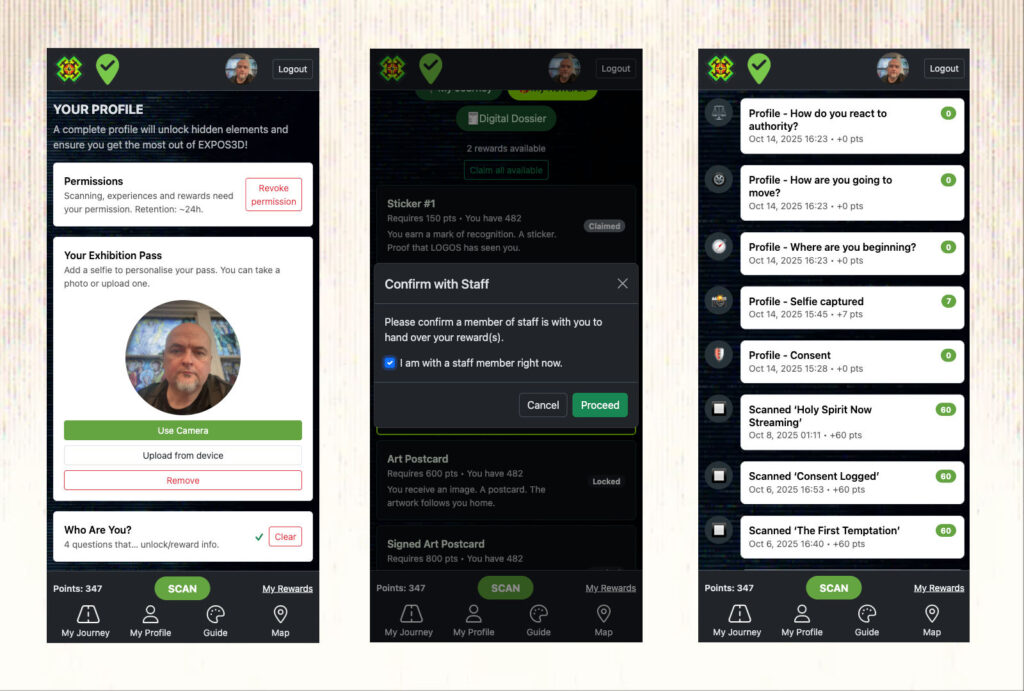 The EXPOS3D web app was live from the start – visitors could scan QR codes, earn points, and explore hidden layers of the exhibition. Underneath, I was still making refinements: polishing the interface, improving data capture, and stabilising the network as visitor numbers grew.