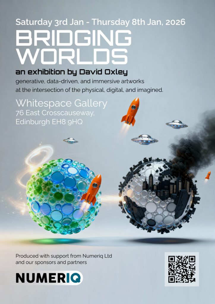 The exhibition spans interactive installations, real-time AI systems, sensor-driven pieces, and pattern-based generative visuals. Many works grew out of collaborations across Scotland’s creative-tech community – including environmental data projects, experimental theatre, and immersive exhibitions – forming interconnected “worlds” shaped through code, motion, atmosphere, and environment.